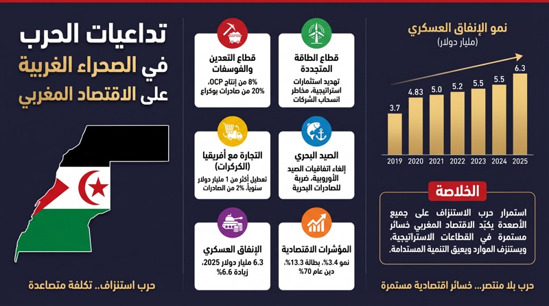 تُظهر التطورات منذ 13 نوفمبر 2020 أن استئناف الحرب في الصحراء الغربية له تأثيرات سلبية متعددة وعميقة على الاقتصاد المغربي. وتمتد هذه التداعيات من تعطيل القطاعات الحيوية كالتعدين والصيد البحري والتجارة العابرة للحدود، إلى زيادة الأعباء المالية الثقيلة على ميزانية الدولة نتيجة تصاعد الإنفاق العسكري المتواصل. ومع استمرار حرب الاستنزاف وتطور تكتيكاتها، من المرجح أن تتفاقم هذه التأثيرات الاقتصادية وتتعمق آثارها على المدى البعيد. هذا الواقع يفرض تحديات جسيمة على صانع القرار في الرباط، ويؤكد أن استمرار الوضع الراهن يحمل تكلفة اقتصادية باهظة، مما يجعل البحث عن حلول سياسية ودبلوماسية عادلة ونهائية ضرورة ملحة لوقف الاستنزاف وتحقيق الاستقرار والتنمية المستدامة.